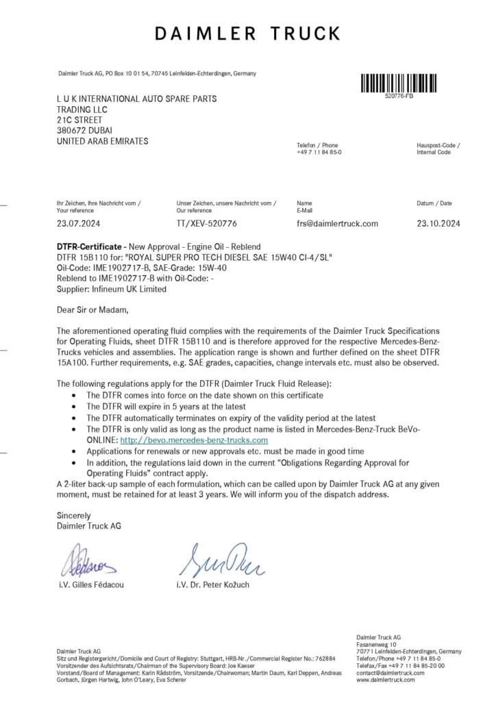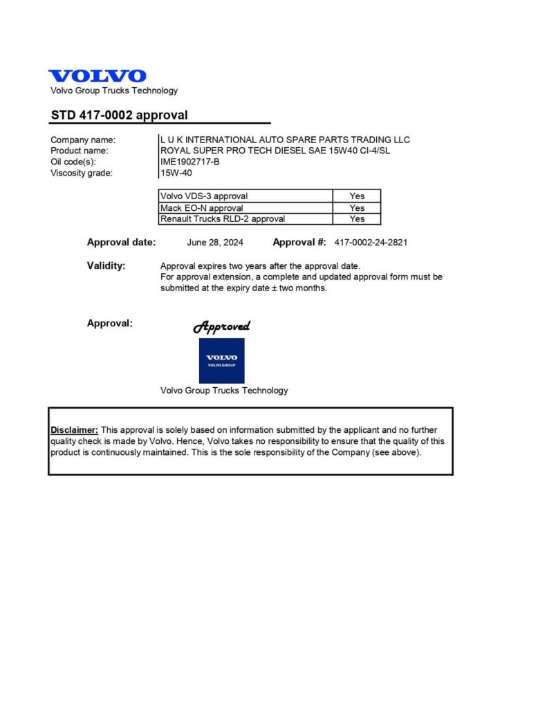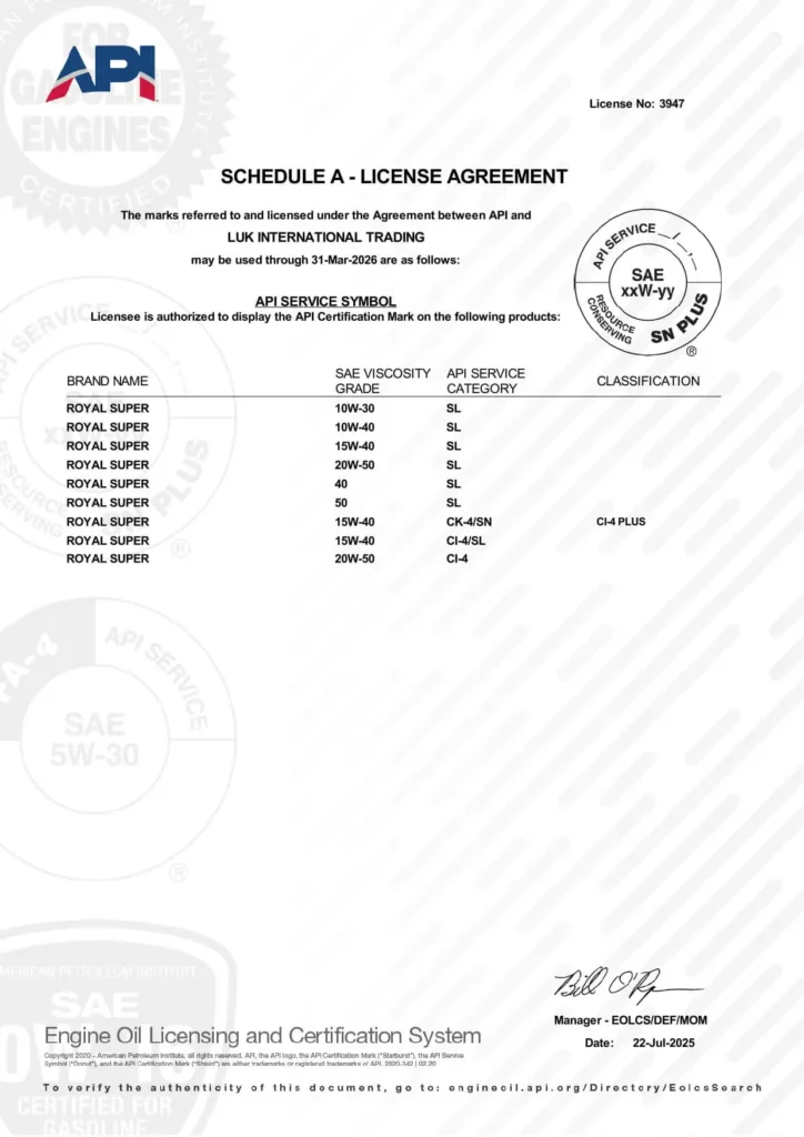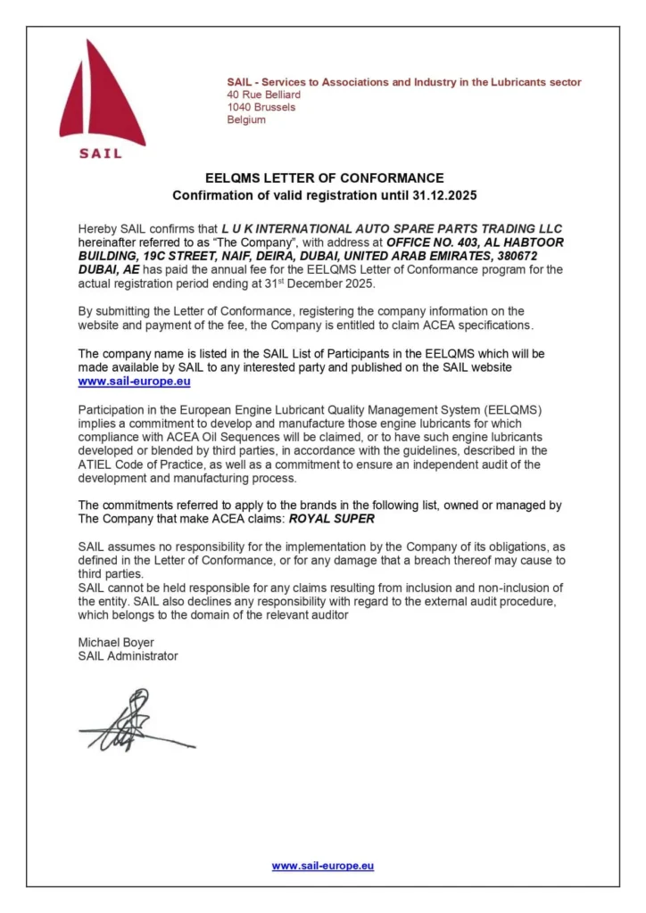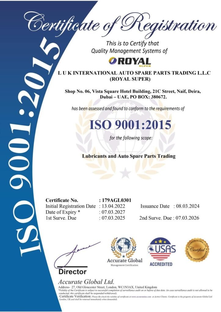 Les lubrifiants Royal Super ont été créés en 2000, Fabricant de lubrifiants aux Émirats Arabes Unis, Fournisseur et exportateur de toutes les gammes de lubricants engine oil Présence mondiale avec une forte implantation en Afrique et en Asie depuis plus de 20 ans. Les normes internationales les plus élevées de qualité répondant aux certifications ISO 9001-2015 et API. Notre laboratoire a été créé et équipé des dernières technologies et machines pour effectuer des tests et des mesures de contrôle qualité afin de garantir un contrôle strict. Le système logistique à la pointe de la technologie offre des opportunités de croissance illimitées et garantit des produits de haute qualité ainsi qu’une capacité exceptionnelle à effectuer des livraisons plus rapides dans le monde entier.